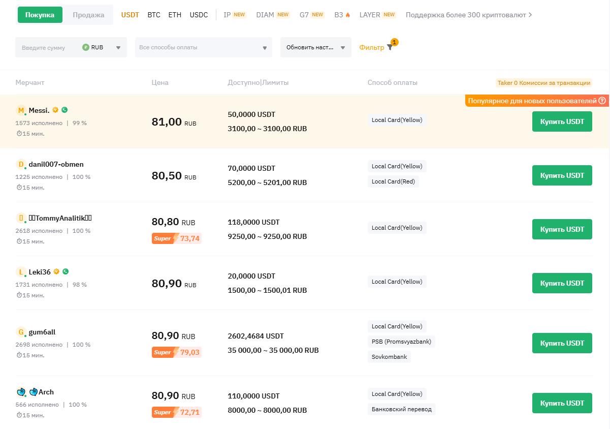 - Bitget: Bitget также имеет развитую P2P-платформу с поддержкой рубля и российских банков. Однако объем торгов и количество активных объявлений здесь, как правило, несколько ниже, чем на Bybit. Это может приводить к чуть менее выгодным курсам и более долгому ожиданию подходящего предложения.