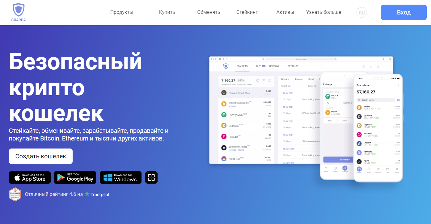 Guarda — мультиплатформенный кошелёк, доступный как в виде веб-приложения, так и мобильного и десктопного ПО. Он поддерживает более 70 блокчейнов, включая Bitcoin, и предлагает встроенный обменник, стейкинг и покупку криптовалюты за фиат. Guarda не требует регистрации и не хранит ваши ключи — всё шифруется локально. Однако из-за наличия веб-версии он менее безопасен, чем чисто мобильные или аппаратные решения. Тем не менее, для повседневного использования и быстрого доступа к средствам Guarda остаётся удобным и надёжным выбором.