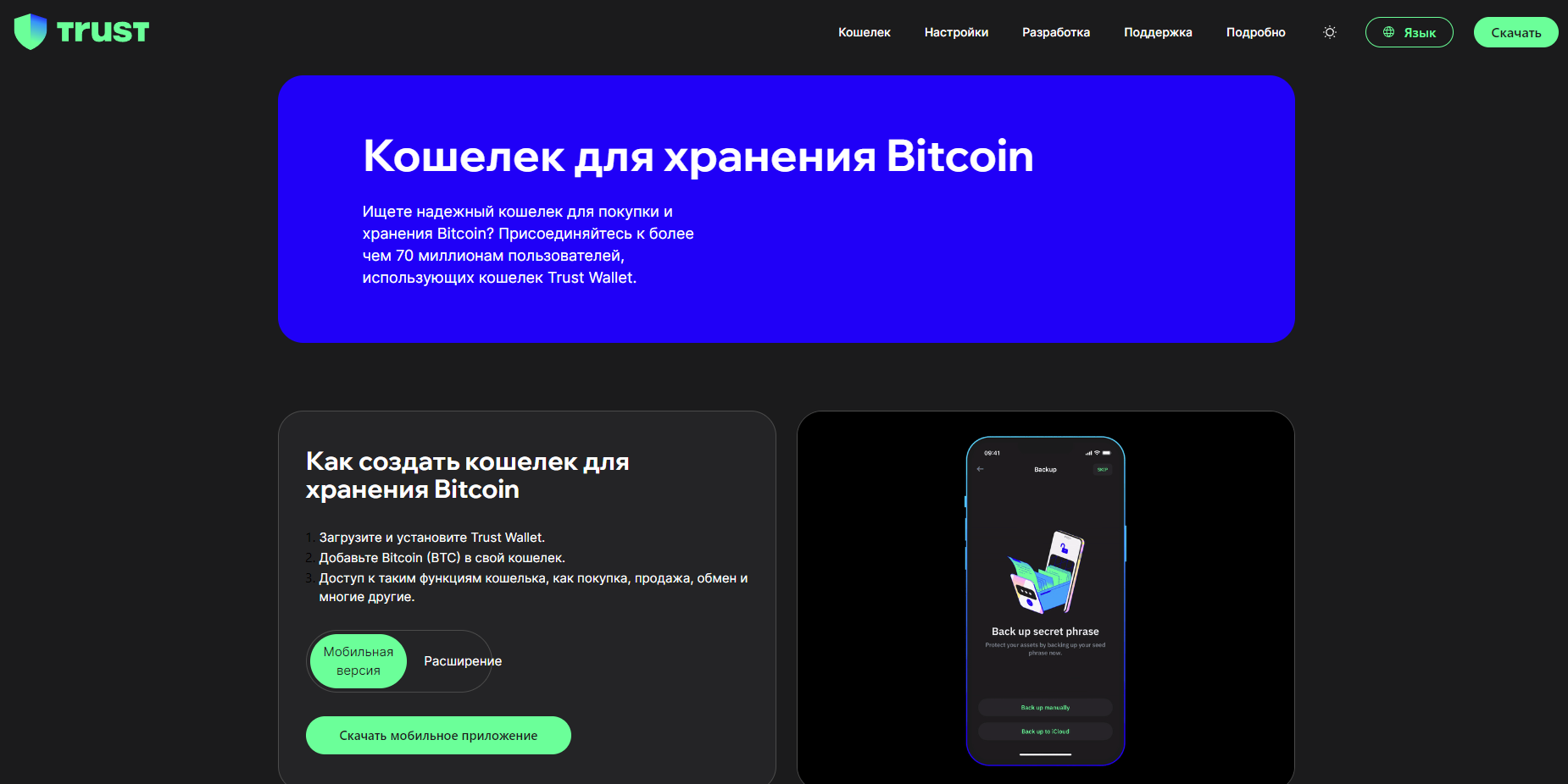 | Trust Wallet | Мобильный | Нет | Да (wBTC) | Средняя | Да | Нет | Нет |